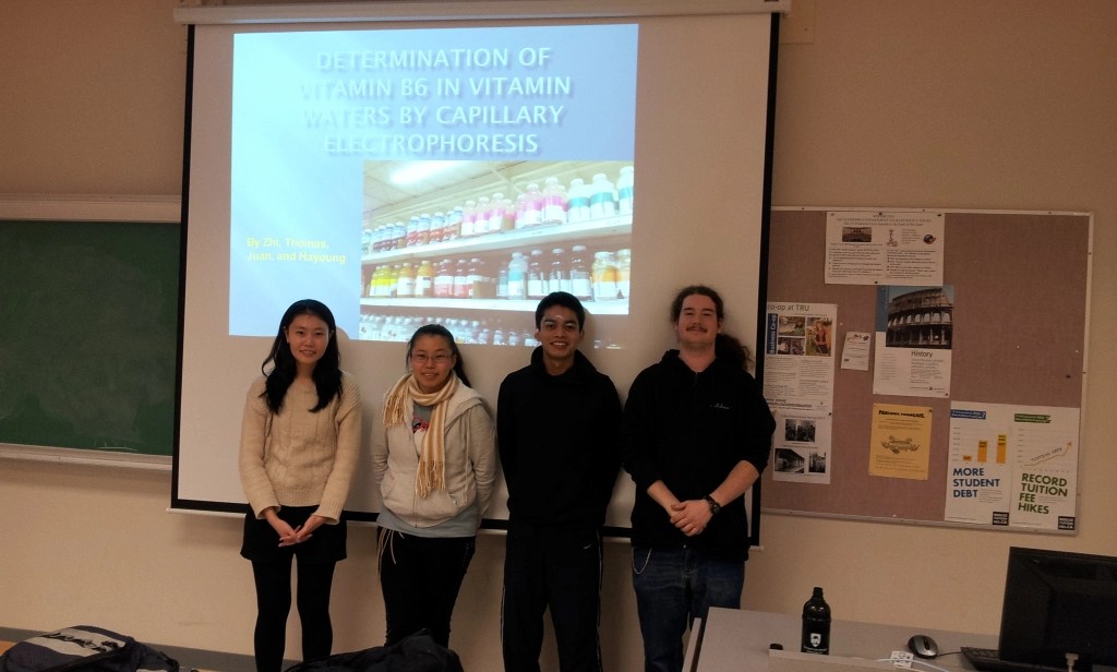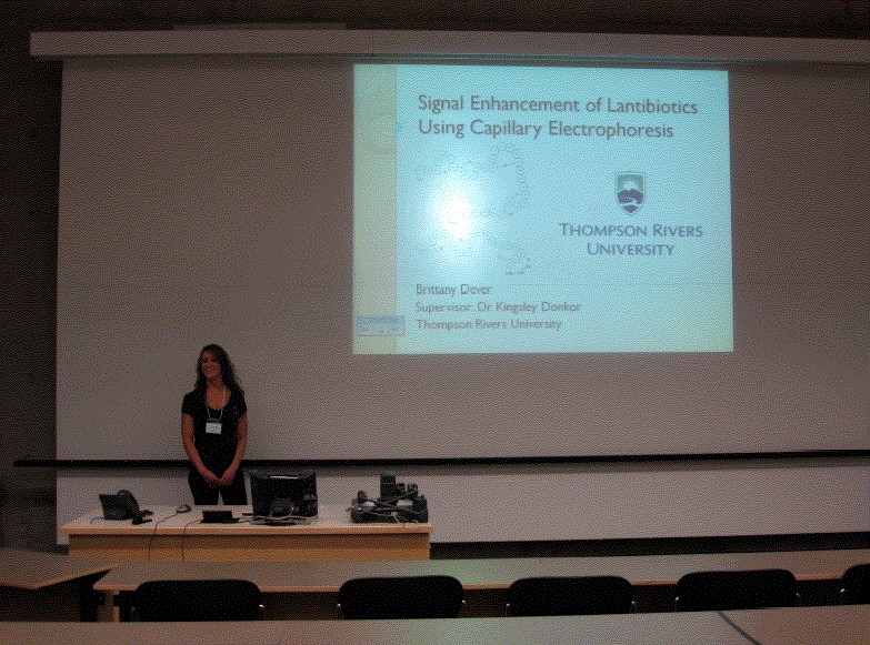 Donkor Research Group photo in 2014Amna Farooq participated in Canadian Cancer Society in 2014 Katie Sparrow was working on the MALDI-MS in 2014CHEM 3100 group project presentation of Hayoung, Zhi, Juan and Thomas in 2013Donkor Research Group photo in 2012TRU Presenters at WCUCC 2010Brittany Dever who secured Queen Rlizabeth II entrance scholarship as one of the top four students applying to the Chemical Biology PhD program in 2010Brittany Dever Oral Presentation at WCUCC 2010Derek Bleackley in lab in 2003