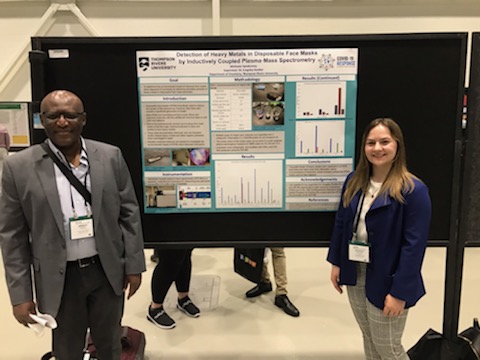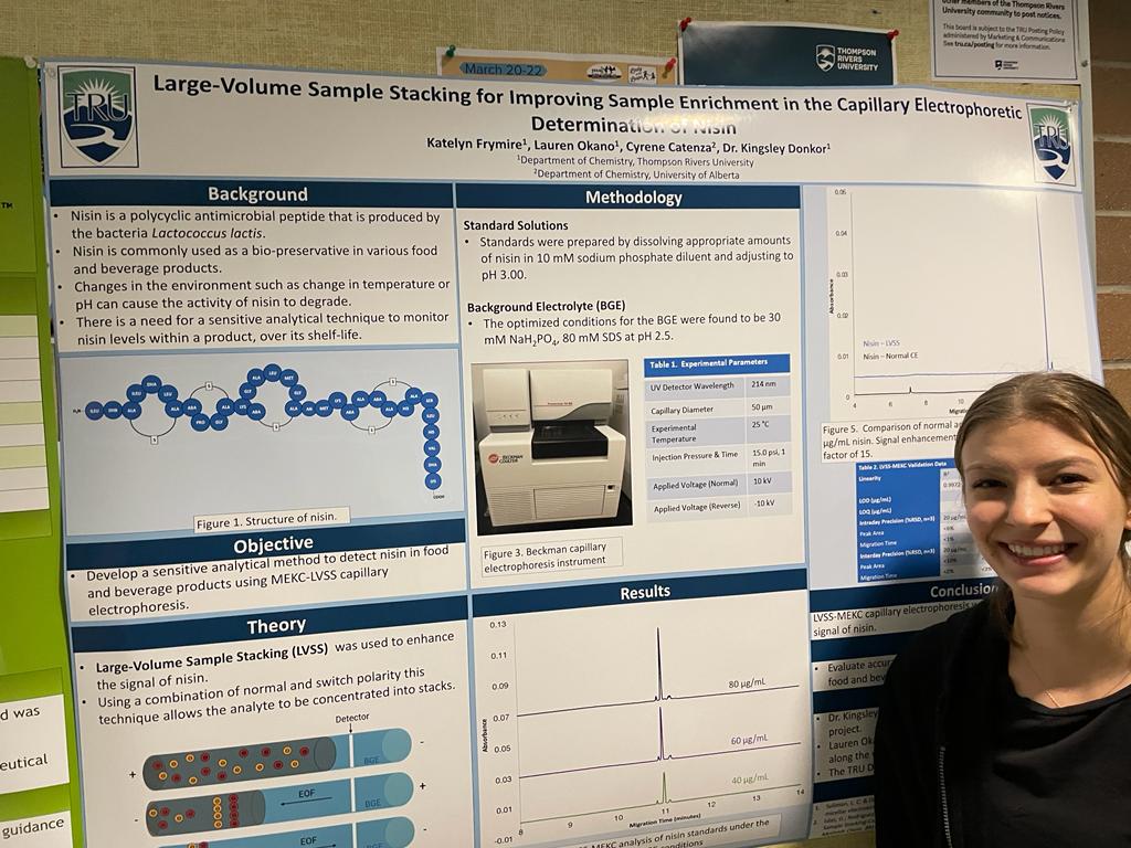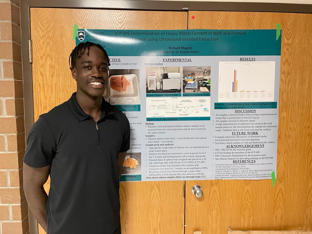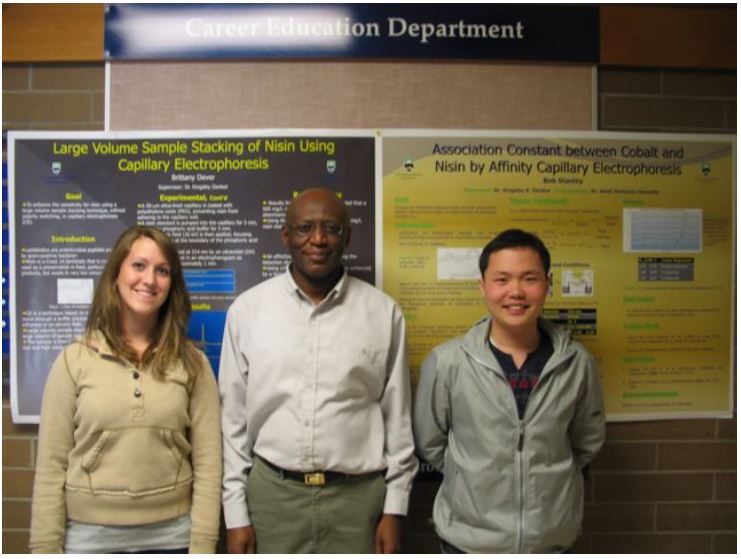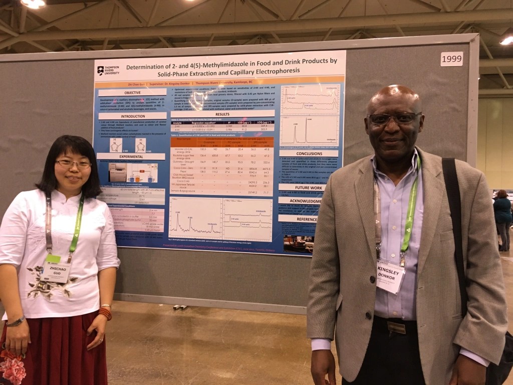 Aramide Taiwo who won the 3rd place at TRU 3 Minute Thesis competition in 2020. Her topic is “How harmful are poultry farms close to lakes?”Donkor Research Group summer gathering in 2019Lauren Okano was discussing her poster at Undergraduate Research Coach Activity in 2019Tyson Bodor (left) who won the 1st prize ACD Undergraduate Poster Presentation Award at Canadian Society of Chemistry Conference in Edmonton, and his supervisor Dr. Kingsley Donkor (right) in 2018Tyson Bodor was explaning his project at 100th CCCE in 2017Tyson Bodor (middle) who won the Best Technical Paper Presentation at Canadian Mineral Analysts Conference in Kamloops, BC in 2017Isra Jaffar was presenting her poster in 2017 Zhi Chao Guo (left) presented her poster at 100th CCCE in 2017, and her supervisor Dr. Kingsley Donkor (right)Ngoc Nguyen’s farewell gathering in 2016Jagdeesh Uppal who won MITACS Globalink Research Award in 2016Donkor Research Group photo in 2016Transformer project tour at BC Hydro in 2015
